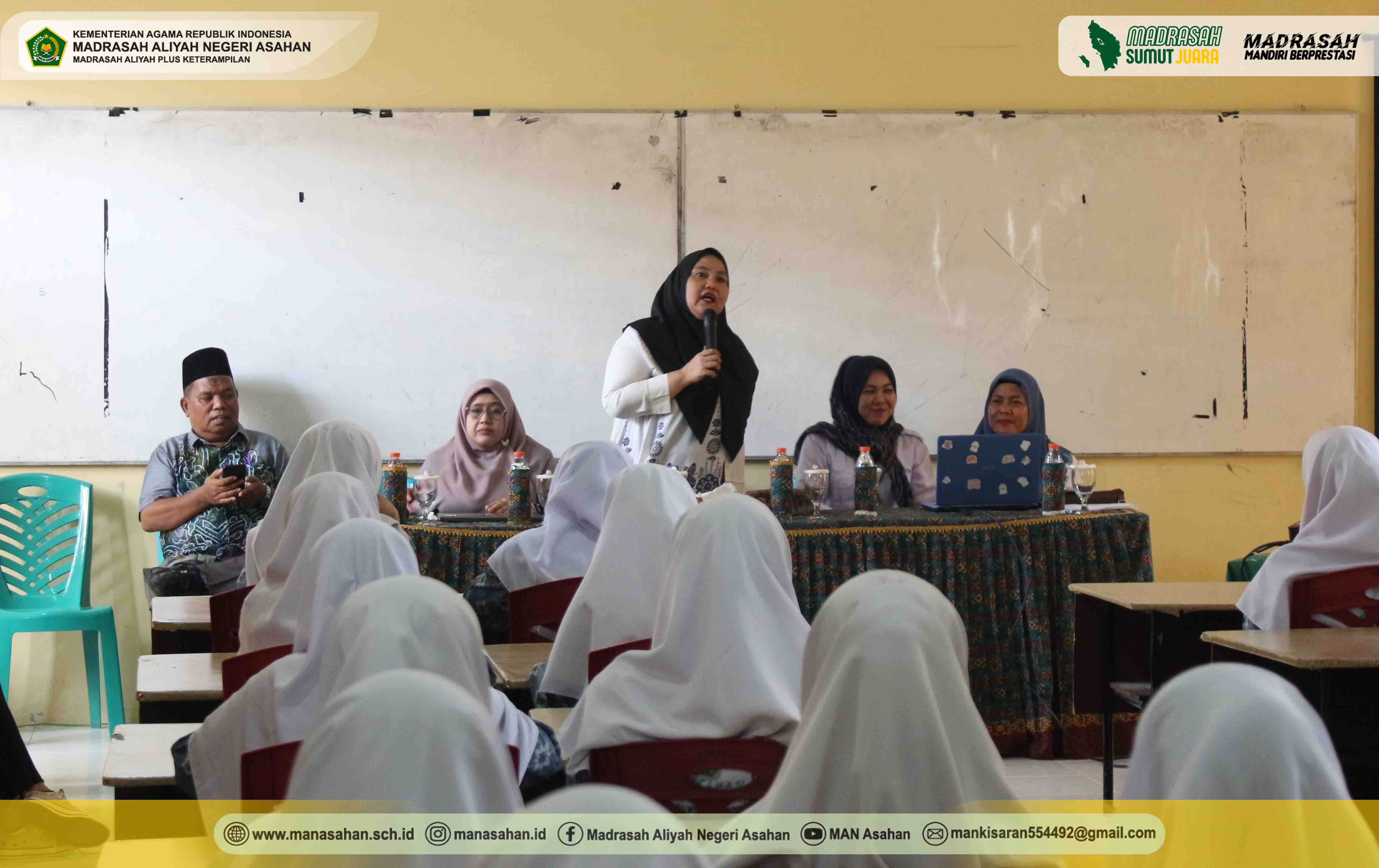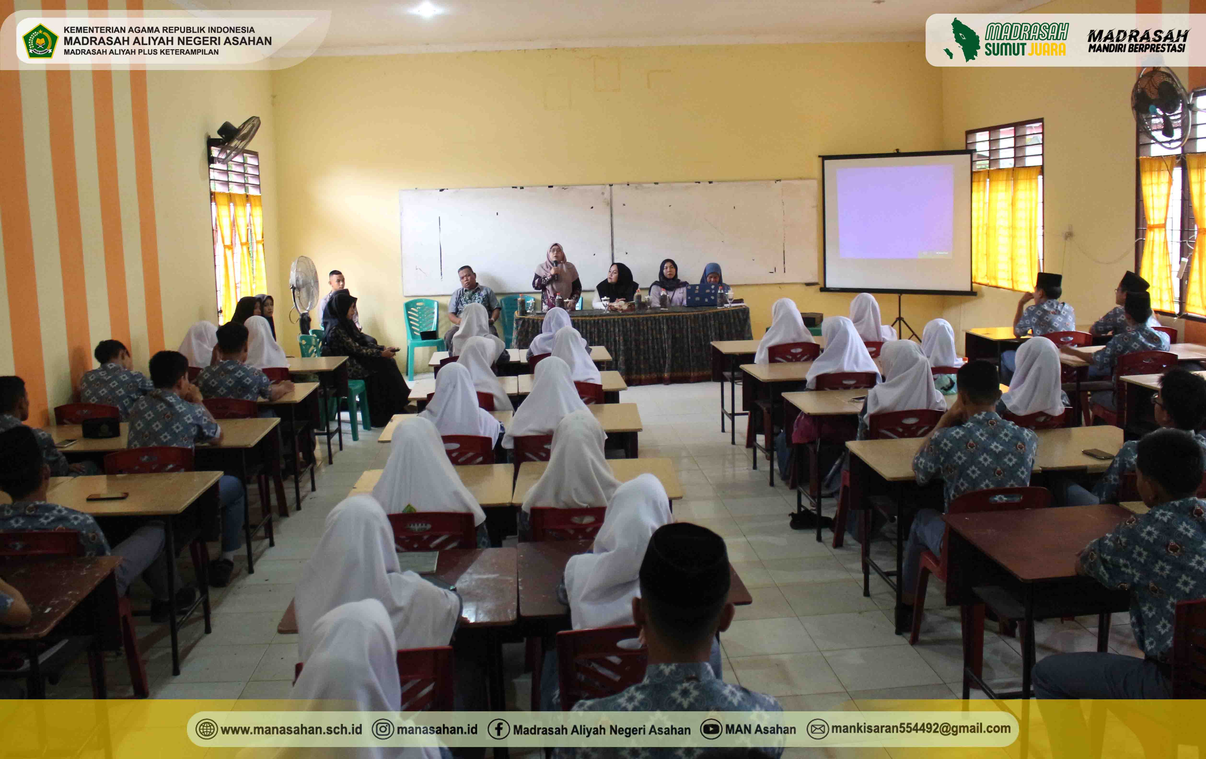 Kisaran (Humas). Sebanyak enam puluh orang peserta didik MAN Asahan mengikuti kegiatan Sosialisasi “Tentang Kita” Untuk Remaja yang diselenggarakan oleh Dinas Pengendalian Penduduk, Keluarga Berencana, Pemberdayaan Perempuan dan Perlindungan Anak (DPPKBP3A) Kabupaten Asahan di ruang kelas MAN Asahan, Rabu (15/5/2024). Kegiatan ini dihadiri Kepala Bidang Keluarga Sejahtera DPPKBP3A Kabupaten Asahan Dewi Dani Hasibuan, SH didampingi oleh Kepala MAN Asahan Dra. Hj. Elda Ayumi, M.Si.