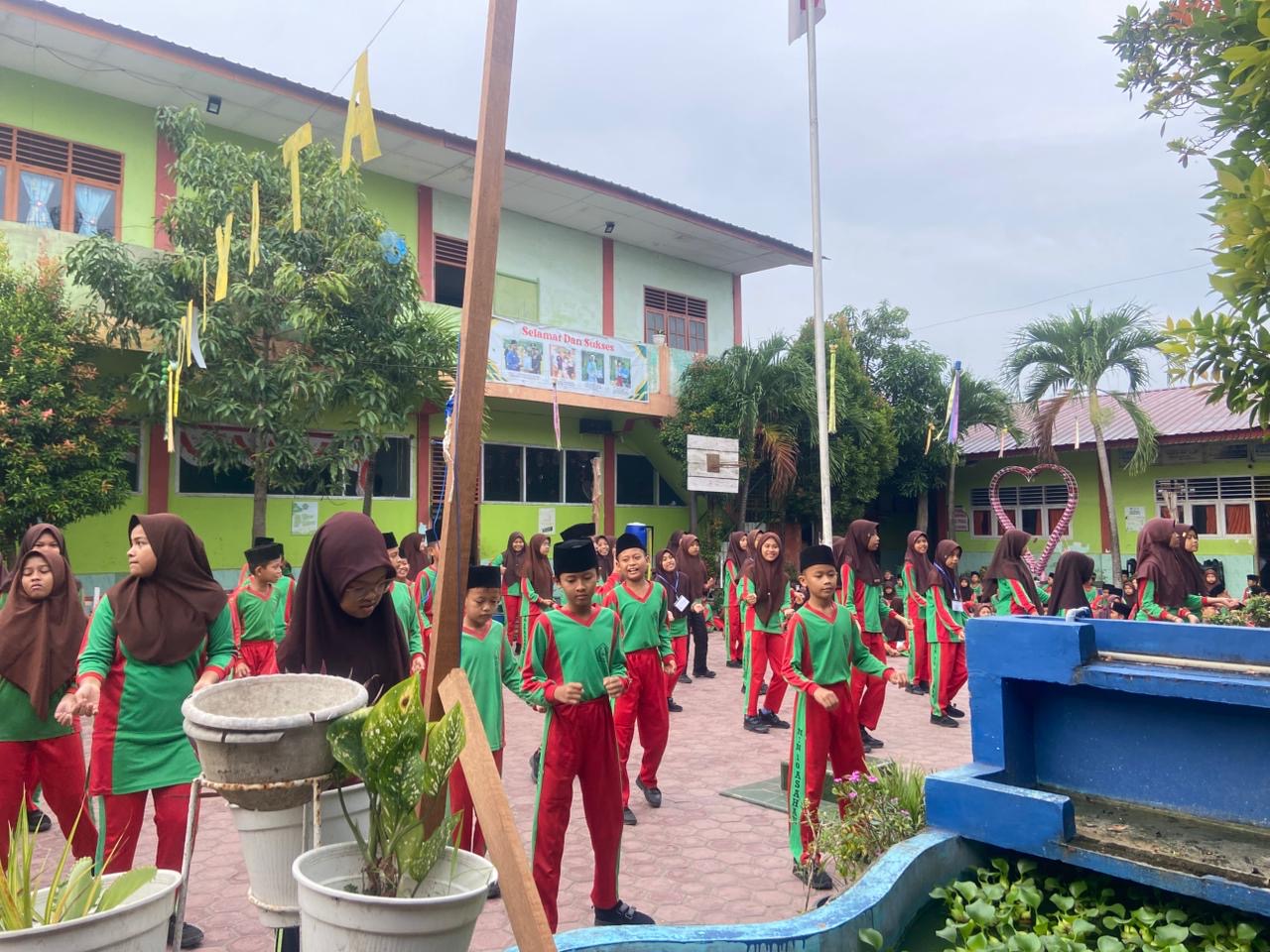 Tidak hanya siswa kelas akhir, para guru dan staf madrasah turut memberikan dukungan moral. Beberapa guru tampak memberi semangat, sementara yang lainnya membantu mengatur jalannya ujian dengan tertib. Musik energik yang diputar oleh panitia semakin menambah keceriaan suasana.