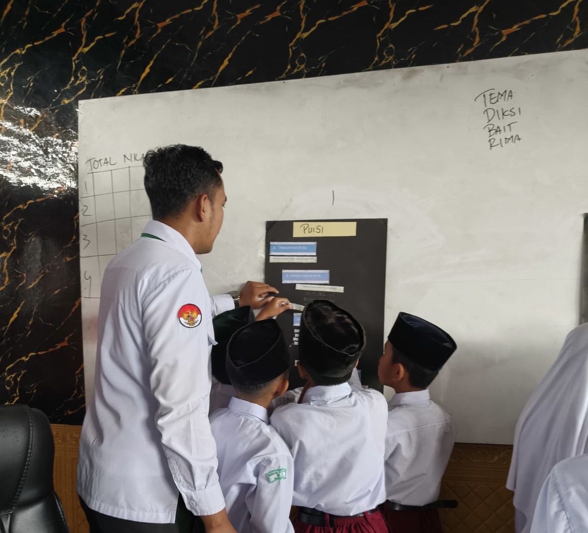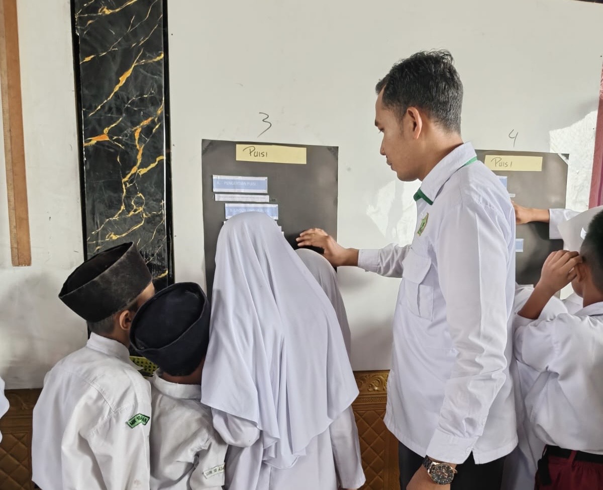 Dengan tertib, siswa maju satu per satu untuk menempelkan kartu mereka. Kartu yang berisi pengertian puisi ditempatkan pada bagian pengertian, sedangkan potongan isi puisi disusun secara runtut agar membentuk makna yang utuh. Kegiatan ini tidak hanya melatih pemahaman siswa, tetapi juga kerja sama dan ketelitian.