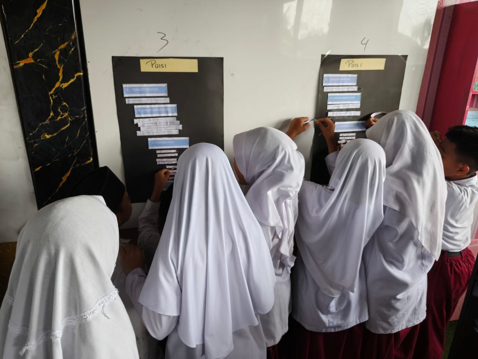 Agar pembelajaran lebih interaktif, siswa dibagi menjadi empat kelompok yang terdiri dari kelompok laki-laki dan perempuan. Setiap siswa diberikan kartu berisi potongan materi puisi yang berbeda. Tugas mereka adalah menempatkan kartu tersebut pada papan karton sesuai kategori yang tepat.
