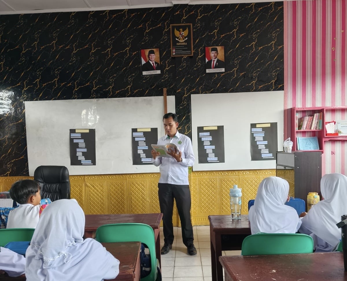 Kegiatan diawali dengan pengecekan kehadiran siswa serta interaksi ringan untuk menciptakan suasana belajar yang nyaman. Selanjutnya, Muhammad Rizki, S.Pd., mengarahkan siswa untuk membuka buku pelajaran dan mulai menjelaskan materi puisi secara bertahap, mulai dari pengertian hingga amanat yang terkandung dalam puisi. Untuk memperjelas pemahaman siswa, guru juga menampilkan contoh pembacaan puisi melalui video yang ditayangkan menggunakan infokus.