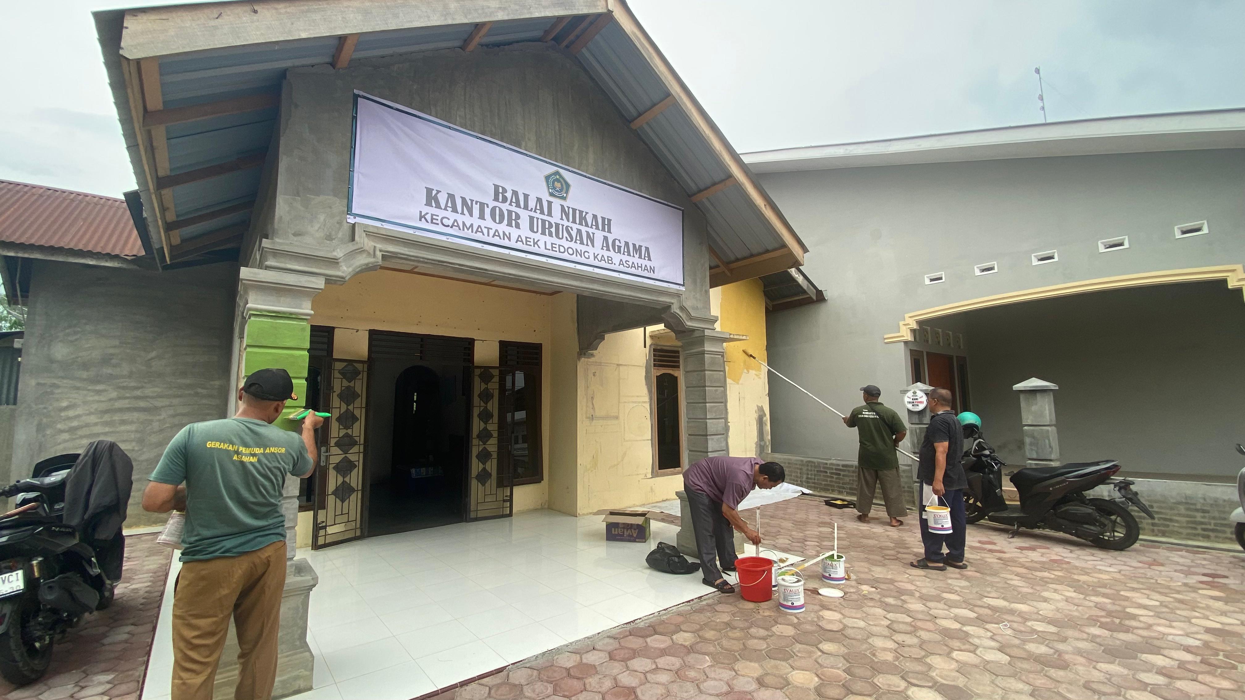 Aek Ledong, (Humas). Semangat kebersamaan dan kekeluargaan tampak jelas di Kantor Urusan Agama (KUA) Kecamatan Aek Ledong, Kab. Asahan. Dipimpin langsung oleh Kepala KUA, M. Tahir Nabil, S.Ag, seluruh staf bergotong royong melakukan pengecatan ulang dan penataan kantor, Sabtu (22/09). Kegiatan ini bertujuan untuk menciptakan lingkungan kerja yang lebih nyaman, bersih, dan representatif bagi masyarakat.