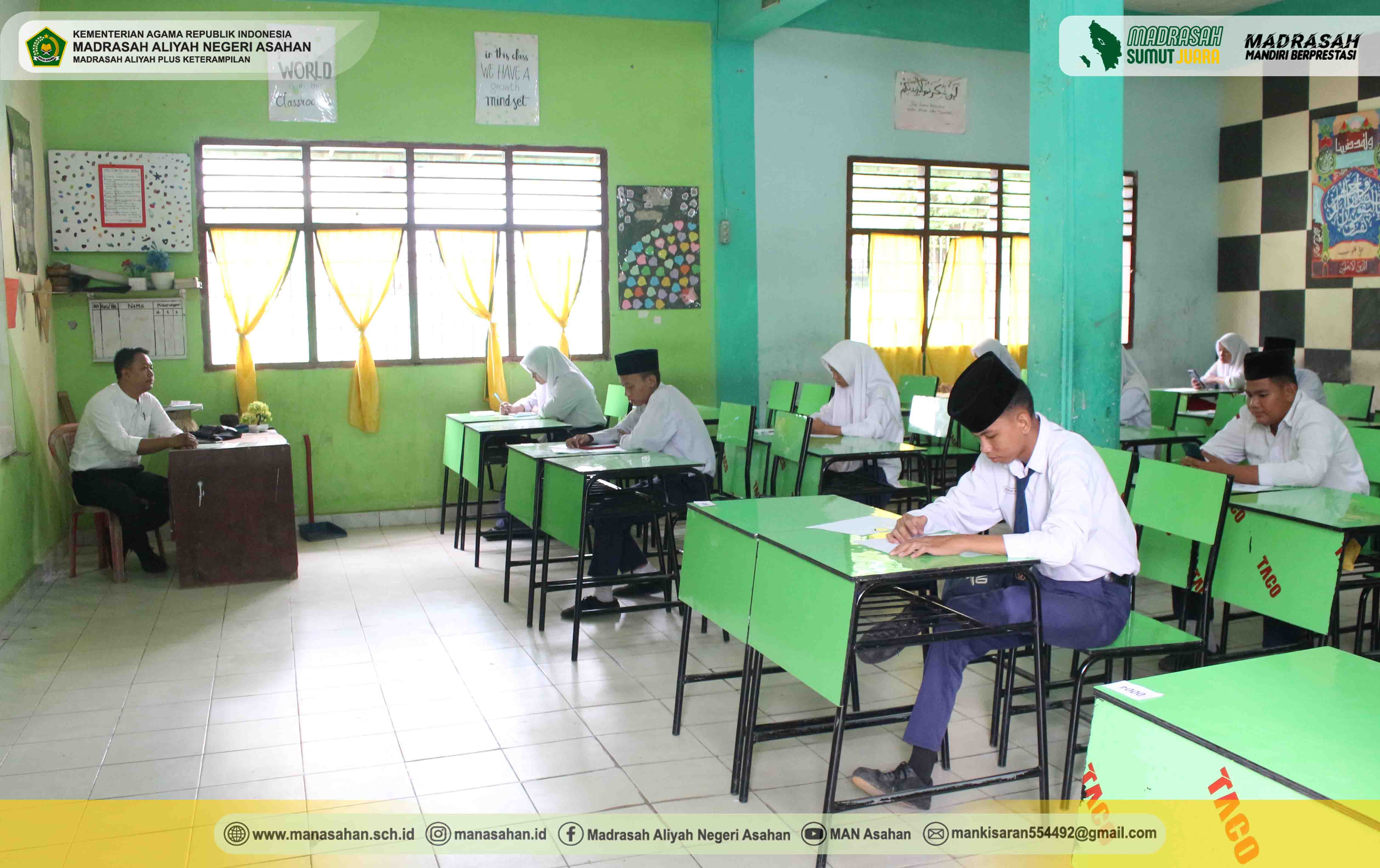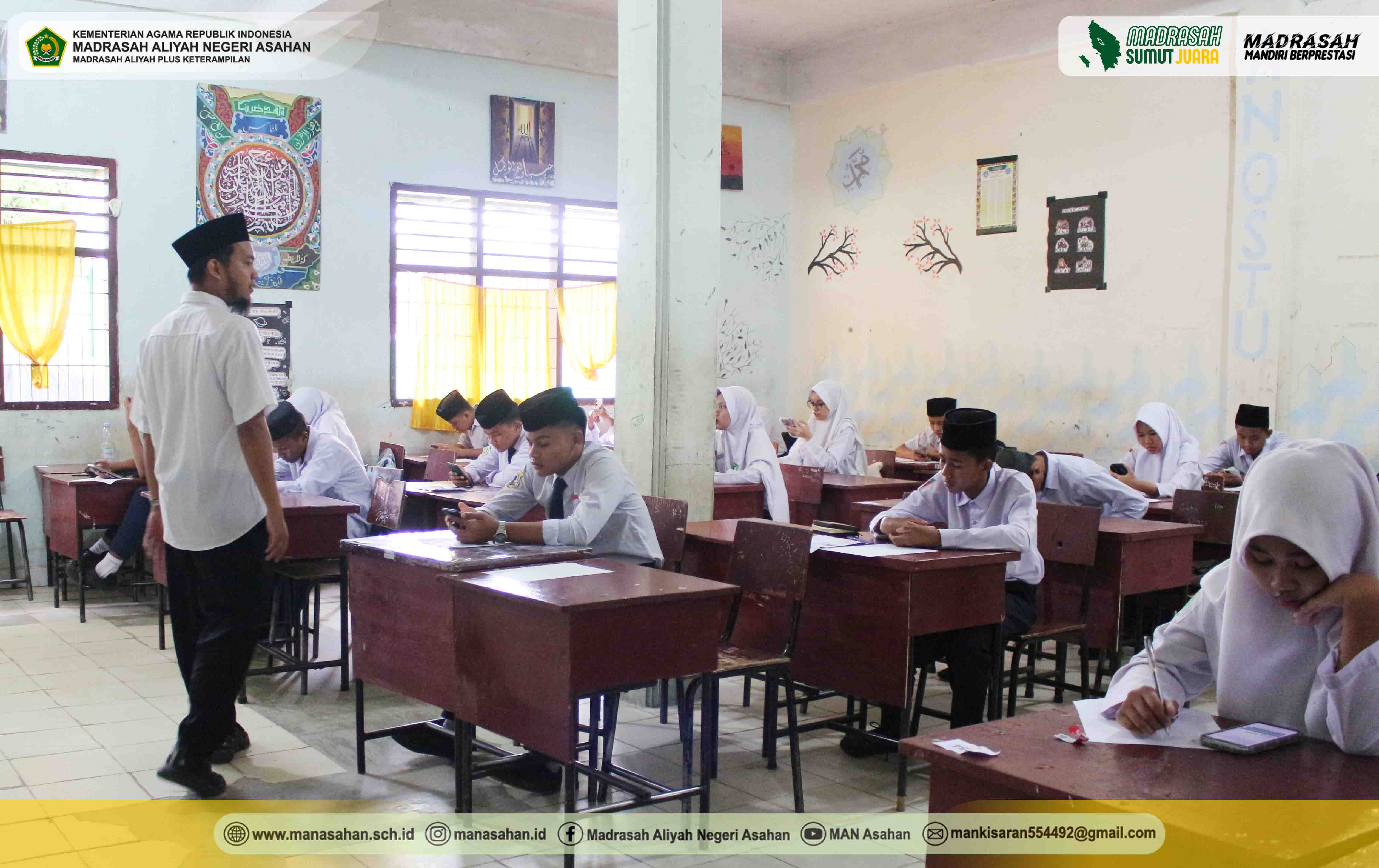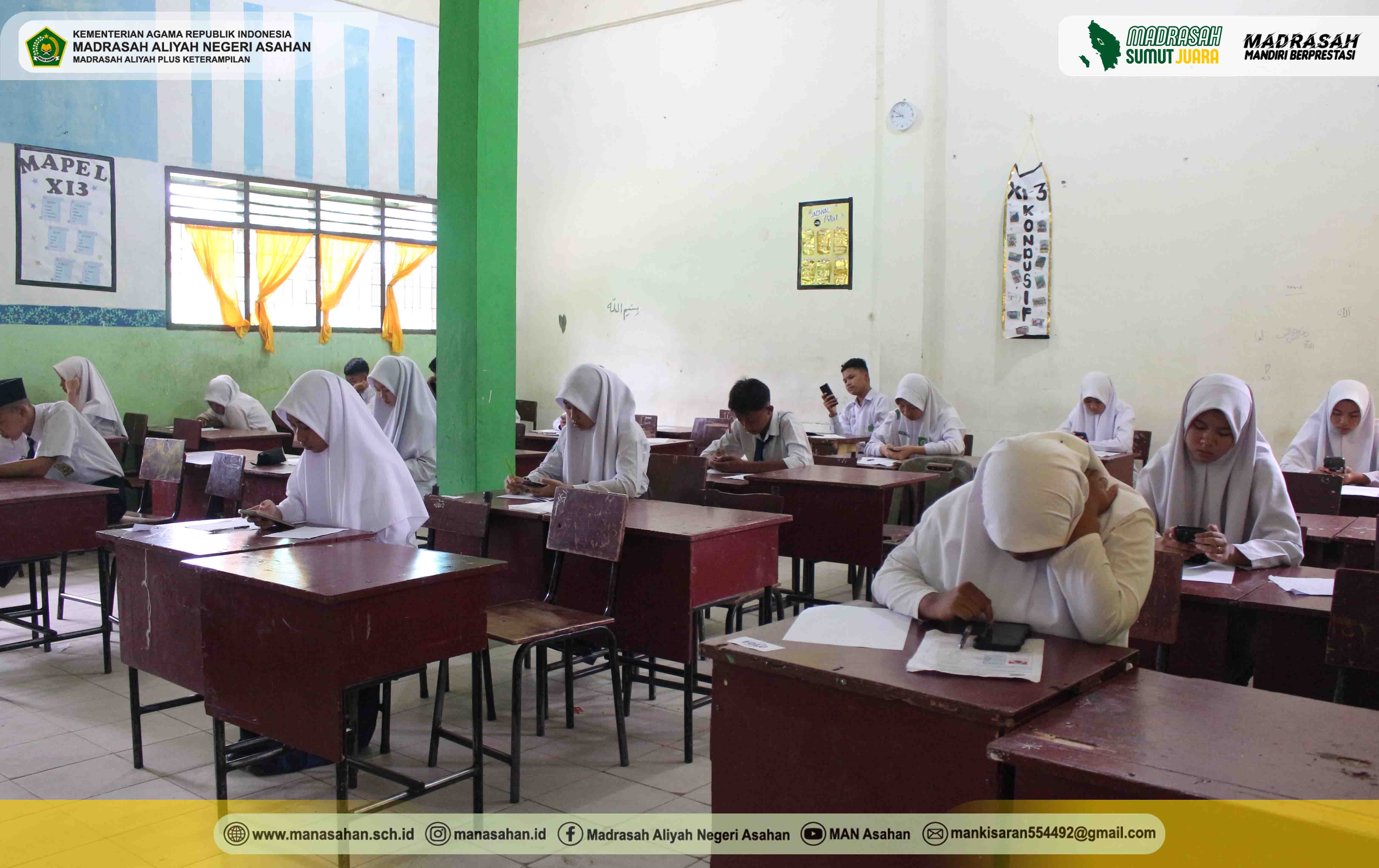 “Waktu pelaksanaan tes akademik selama 90 menit, dimulai pukul 08.00 s.d 09.30 WIB. Jika nanti pada saat pelaksanaannya terdapat kendala, ananda semua silahkan lapor ke bapak dan ibu pengawas ruangan supaya dibantu untuk mengatasinya. Jika gadget androidnya tidak memungkinkan untuk digunakan, silahkan ananda gunakan laptop yang telah tersedia di ruang laboratorium komputer MAN Asahan, nanti disitu ada petugas yang standby mengawasi”, lanjut Elda Ayumi.