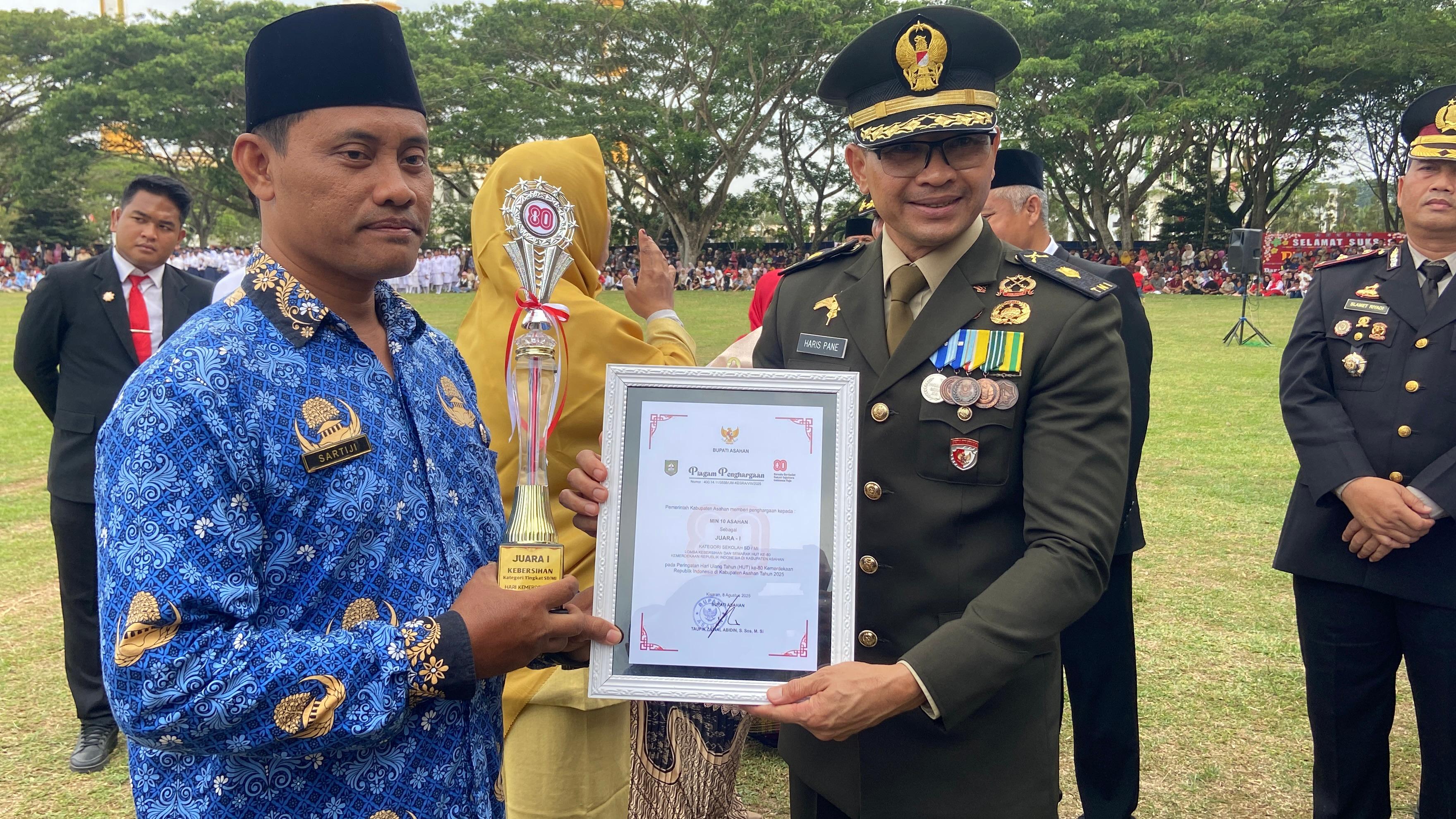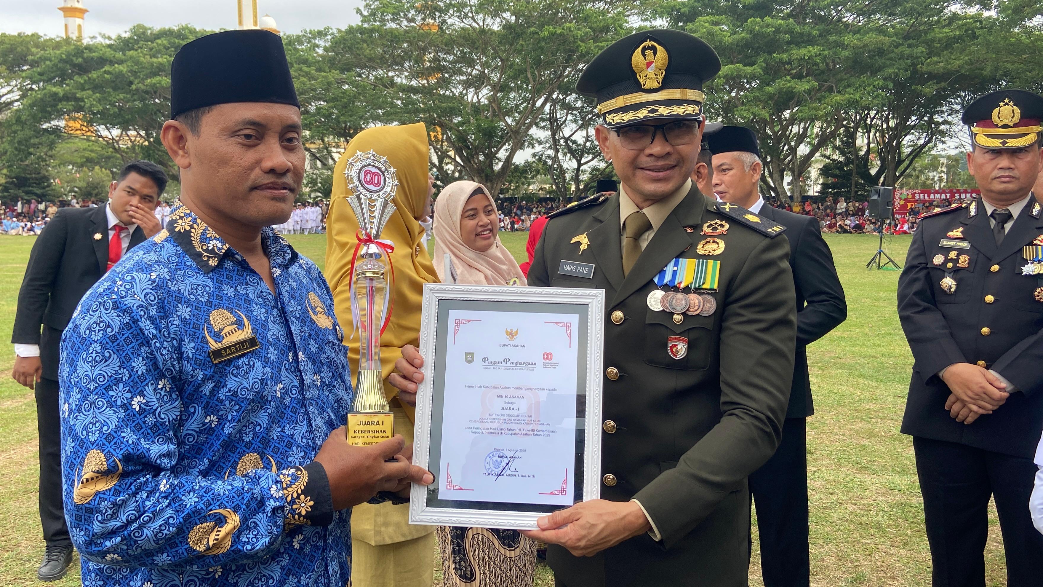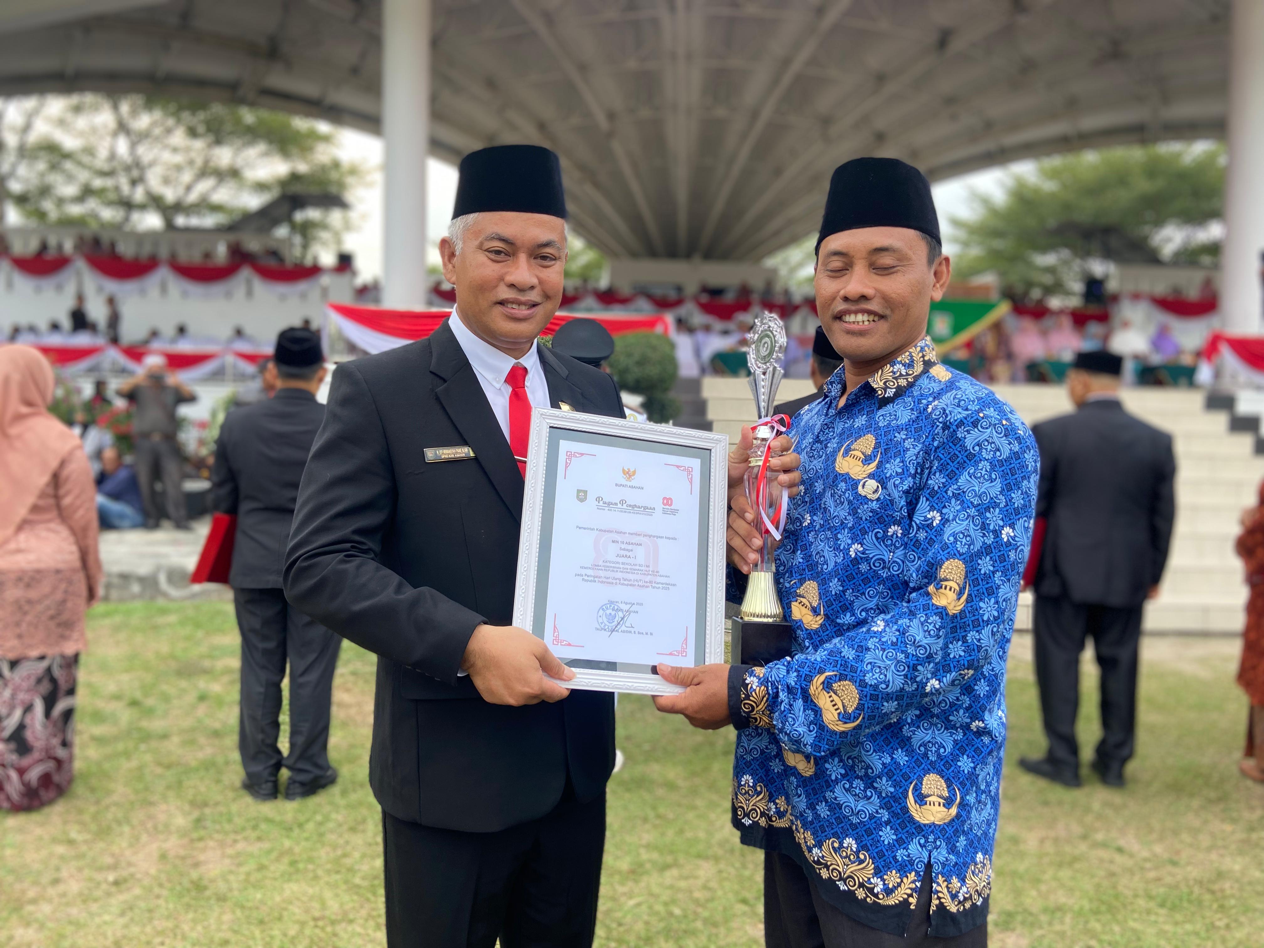 Kisaran (Humas). Madrasah Ibtidaiyah Negeri (MIN) 10 Asahan kembali menorehkan prestasi membanggakan di tingkat Kabupaten Asahan. Pada peringatan Hari Ulang Tahun ke-80 Kemerdekaan Republik Indonesia, Pemerintah Kabupaten Asahan mengumumkan hasil lomba kebersihan antar sekolah dan instansi se-Kabupaten Asahan. Dalam pengumuman yang berlangsung khidmat di Lapangan Alun-Alun Kisaran, MIN 10 Asahan dinobatkan sebagai Juara 1 Lomba Kebersihan tingkat kabupaten (17/08/2025).