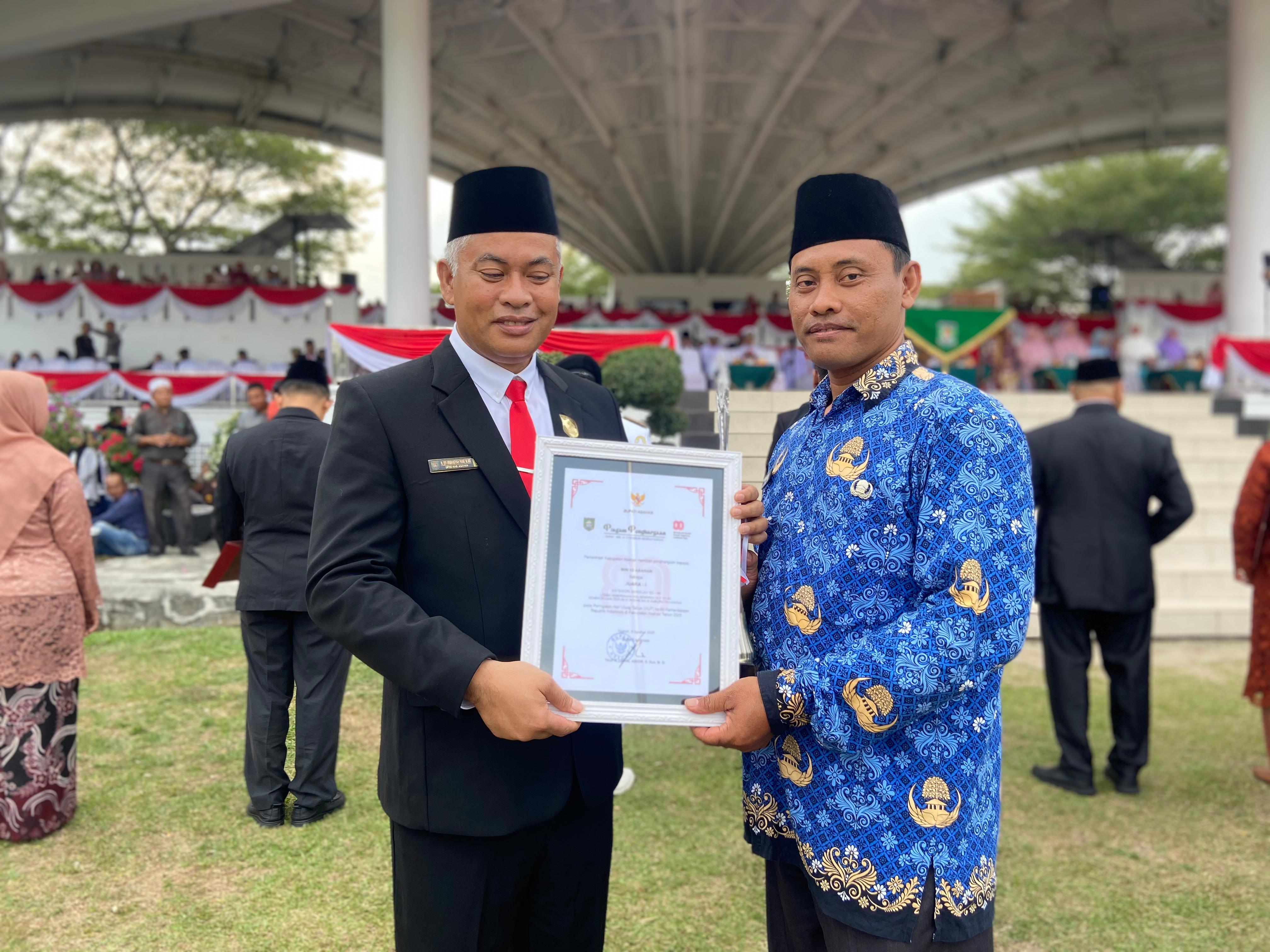 Penghargaan ini diberikan langsung kepada Kepala MIN 10 Asahan, Sartiji, S.Pd.I, MM, yang hadir didampingi oleh Humas MIN 10 Asahan. Suasana penuh haru dan kebanggaan tampak saat nama MIN 10 Asahan disebut sebagai pemenang utama, disambut tepuk tangan meriah dari peserta upacara dan undangan yang hadir.