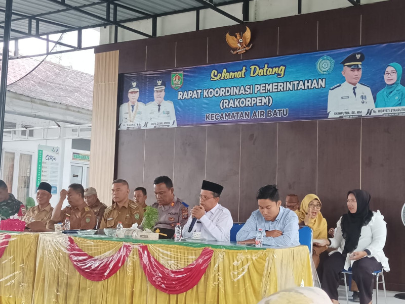 Air Batu – Pada Selasa, 15 Oktober 2024, Rapat Koordinasi Pemerintahan (Rakorpem) digelar di Aula Kantor Camat Air Batu. Acara tersebut dipimpin oleh Camat Air Batu, Syahputra, S.E., M.M., dan dihadiri oleh berbagai elemen pemerintahan setempat, termasuk Kapolsek, Koramil, Kepala Desa se-Kecamatan Air Batu, Kepala Dusun, Kepala Sekolah, serta Kepala UPT lainnya. Dalam pertemuan ini, sejumlah isu penting dibahas, mulai dari kebijakan terkait PMA 22/2024, program sertifikasi tanah wakaf, hingga upaya penertiban geng motor.