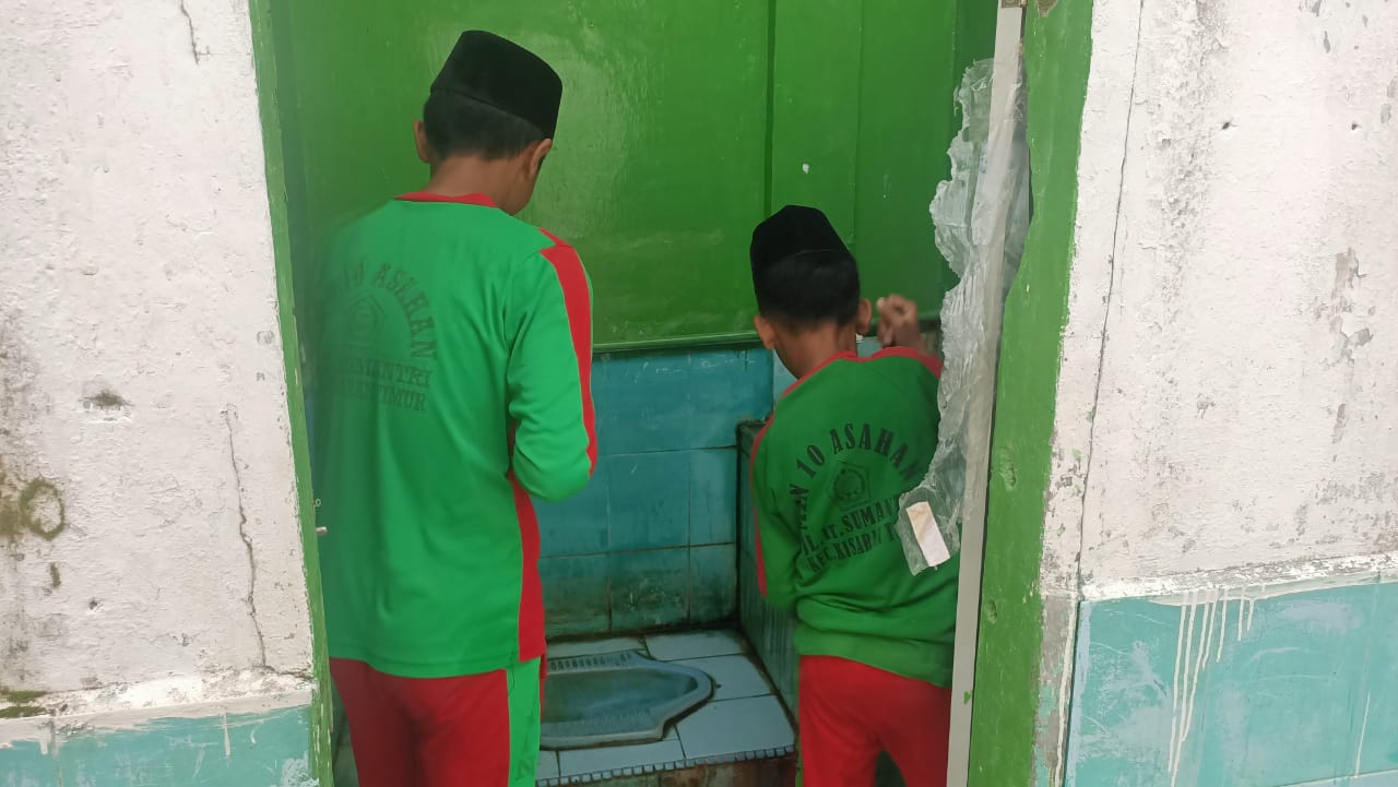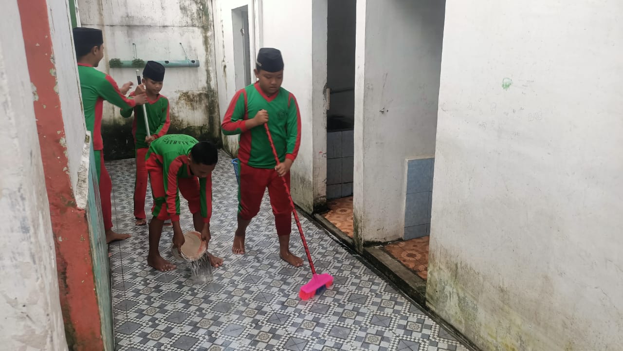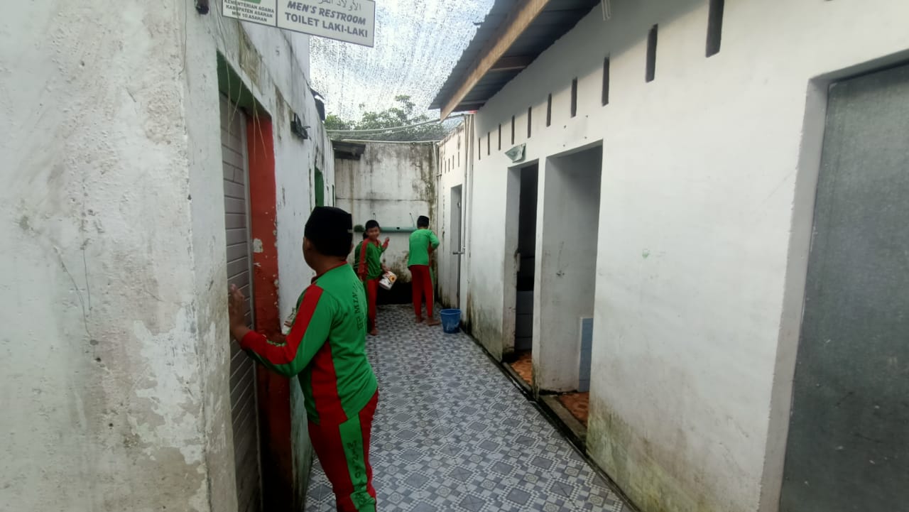 Dengan peralatan kebersihan di tangan, peserta didik dari berbagai kelas dengan antusias membersihkan kamar mandi siswa yang merupakan bagian penting dari fasilitas madrasah. Mereka tampak kompak dalam menjalankan tugas masing-masing, baik itu menyikat lantai, mencuci dinding, maupun membersihkan bak air.