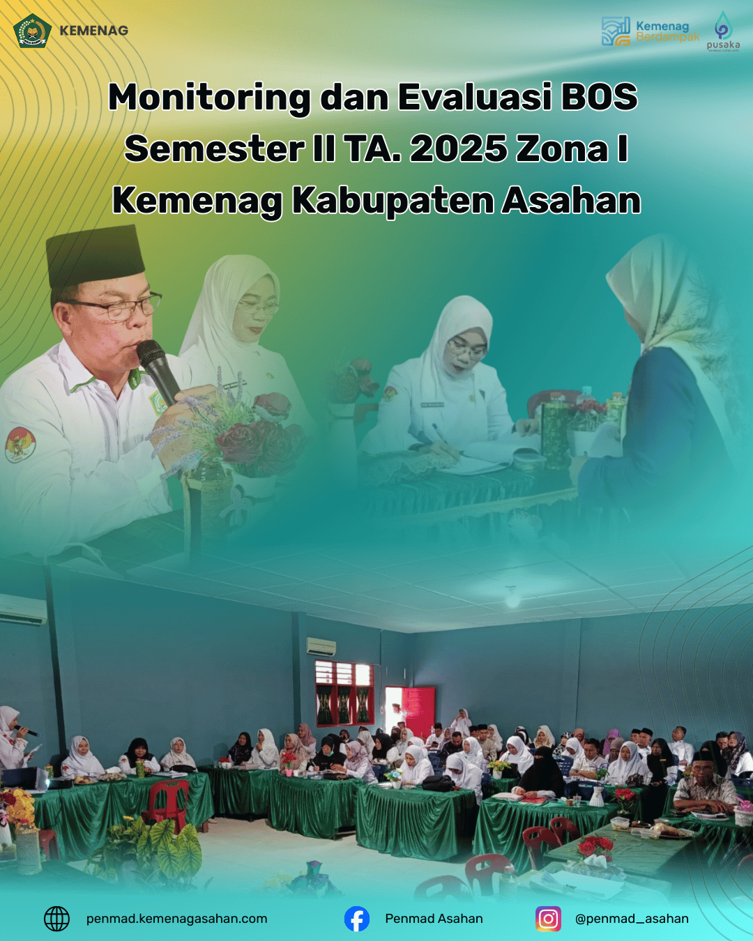 Kisaran (Humas). Kepala kantor Kementerian Agama (Kemenag) Kabupaten Asahan, H. Abdul Manan, MA, beserta Kepala Seksi Pendidikan Madrasah (Seksi Penmad) Kemenag Kabupaten Asahan, Dr. Hj, Sri Muchlis, S. Sos, M. I. Kom, menggelar kegiatan monitoring dan evaluasi (Monev) penggunaan dana Bantuan Operasional Sekolah (BOS) Triwulan III dan IV untuk periode Juli s.d Desember tahun anggaran 2025 di Zona I Kabupaten Asahan. Kegiatan ini diikuti oleh perwakilan madrasah (MI dan MTs) serta RA yang berada di wilayah tersebut.