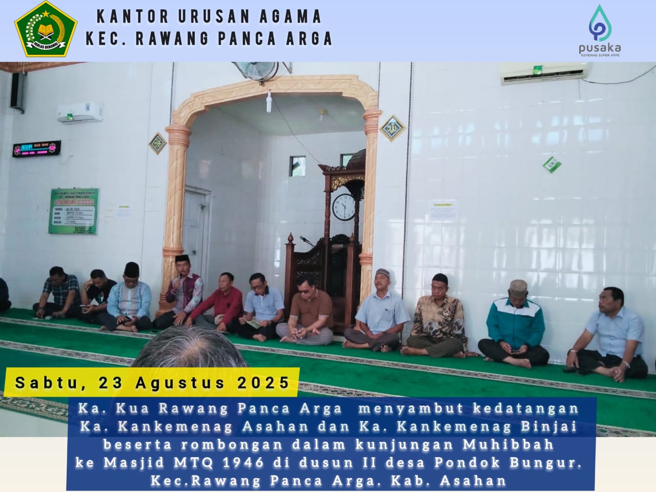 Rawang Panca Arga, 23 Agustus 2025 – Kepala KUA kecamatan Rawang Panca Arga Bapak Muhammad Ya'kub, S.HI menyambut kedatangan rombongan Kepala Kantor Kementerian Agama (Kankemenag) Asahan dan Kepala Kantor Kementerian Agama (Kakankemenag) Binjai di Masjid MTQ 1946. Kunjungan ini merupakan bagian dari upaya melestarikan dan mengenang sejarah penting penyelenggaraan Musabaqah Tilawatil Quran (MTQ) perdana di wilayah tersebut.