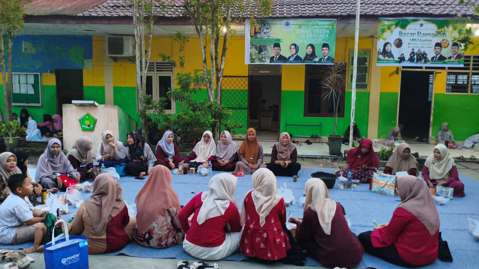 Sebelum acara dimulai, para guru bersama siswa terlihat bergotong royong mempersiapkan tempat kegiatan. Beberapa guru menggelar tikar dan karpet di lapangan yang kemudian dibantu oleh para siswa dengan penuh semangat. Kebersamaan ini menjadi pemandangan yang penuh makna karena mencerminkan nilai kerja sama, kepedulian, dan kebersamaan yang menjadi bagian dari pendidikan karakter di madrasah.