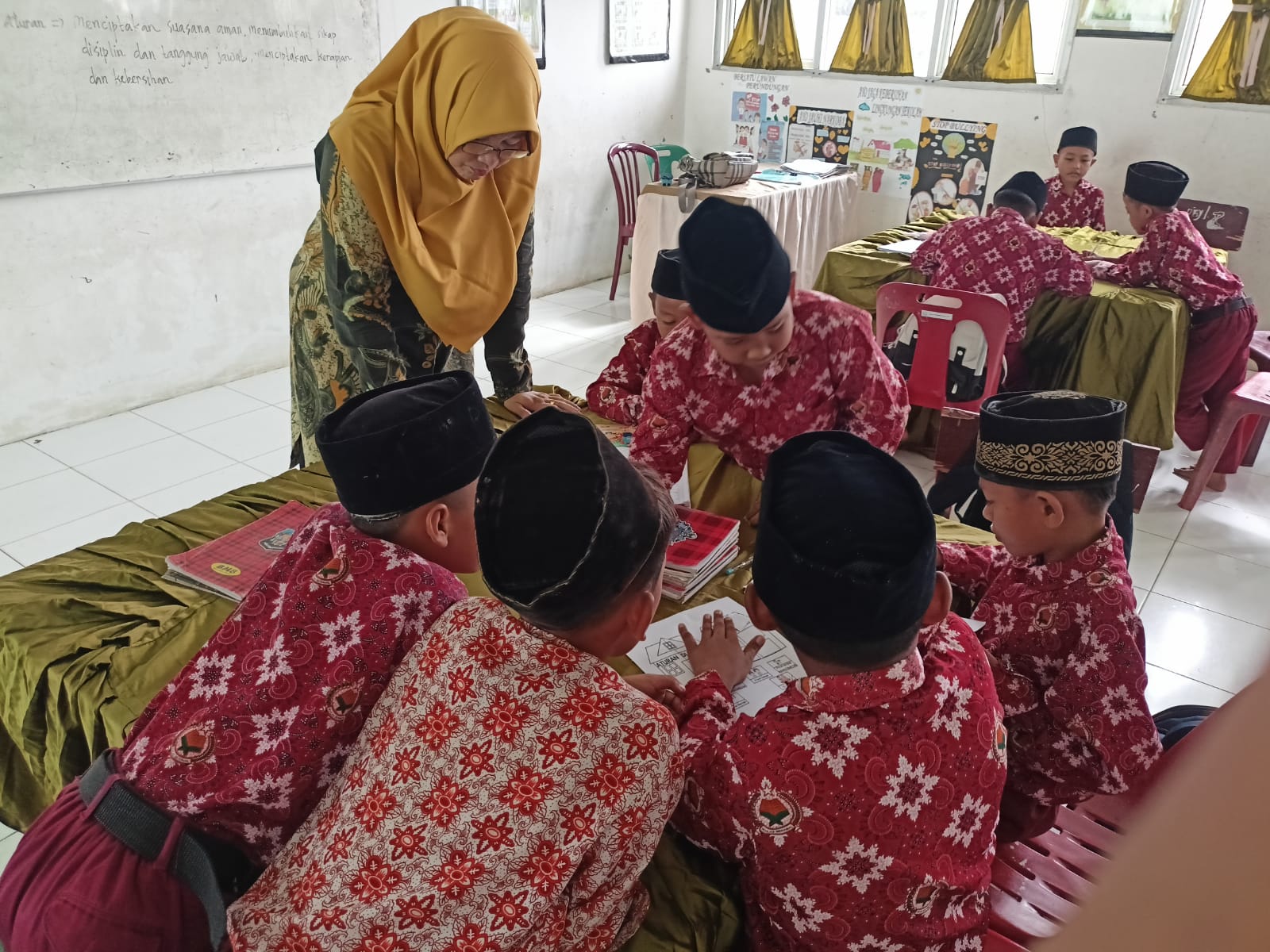 Di dalam kelas, guru menciptakan suasana belajar yang menarik dengan metode diskusi kelompok dan permainan edukatif. Setiap kelompok diminta menceritakan contoh aturan yang berlaku di rumah, seperti bangun pagi tepat waktu, membantu orang tua, dan menjaga kebersihan lingkungan. Sementara itu, aturan di madrasah seperti menghormati guru, menjaga kebersihan kelas, serta mengikuti upacara bendera dengan tertib juga dibahas dengan semangat kebersamaan.