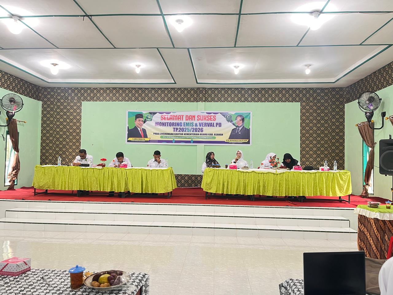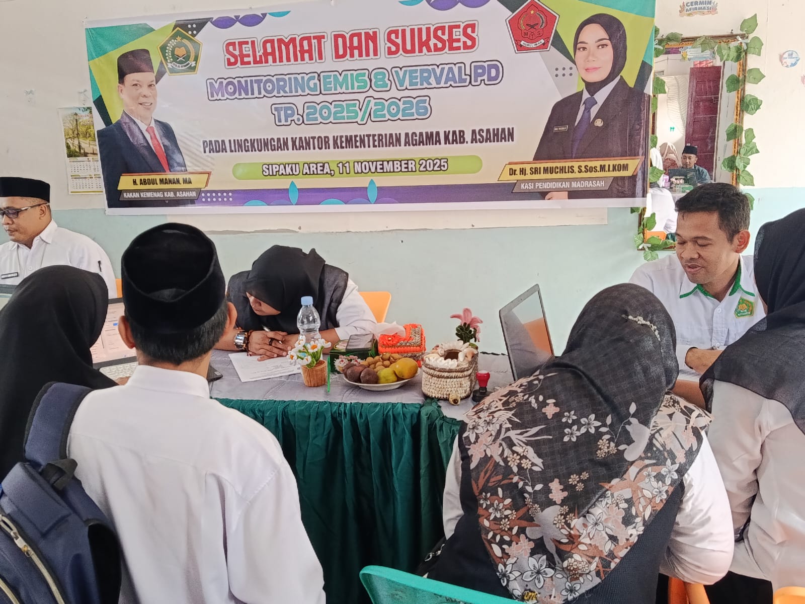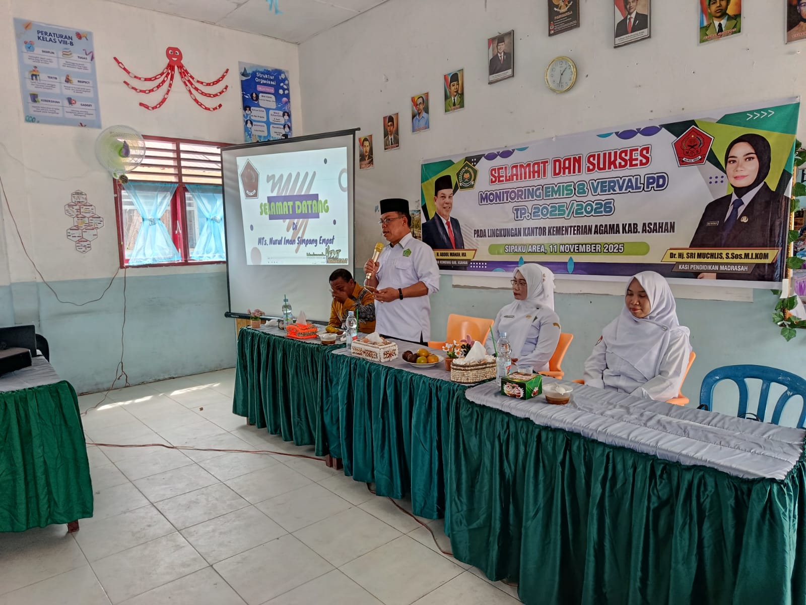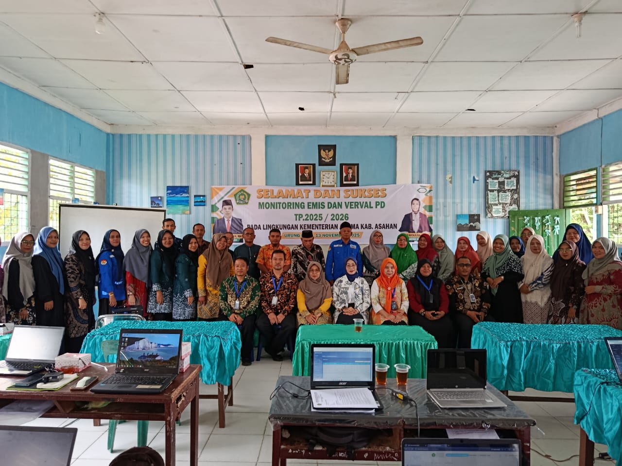 Kisaran (Humas). Seksi Pendidikan Madrasah Kementerian Agama Kabupaten Asahan melaksanakan Monitoring dan Evaluasi (Monev) Emis dan Verval PD untuk tingkat RA, MI, MTs, dan MA se-Kabupaten Asahan Tahun Pelajaran 2025/2026. Kegiatan ini dilaksanakan pada tanggal 10 November 2025 dan berakhir pada tanggal 18 November 2025. Mengingat banyaknya Madrasah yang terdapat pada Kabupaten Asahan, pelaksanaan kegiatan ini dilaksanakan pada 7 zona lokasi yang berbeda dengan harapan semua Kepala dan Operator Madrasah dapat hadir pada kegiatan ini. Kegiatan ini dihadiri oleh Bapak Kepala Kantor Kementerian Agama Kabupaten Asahan H. Abdul Manan, MA. didampingi oleh Ibu Kepala Seksi Pendidikan Madrasah Kementerian Agama Kabupaten Asahan Dr. Sri Muchlis, S. Sos., M. I. Kom. serta seluruh staf Pendidikan Madrasah pada kementerian Agama Kabupaten Asahan.