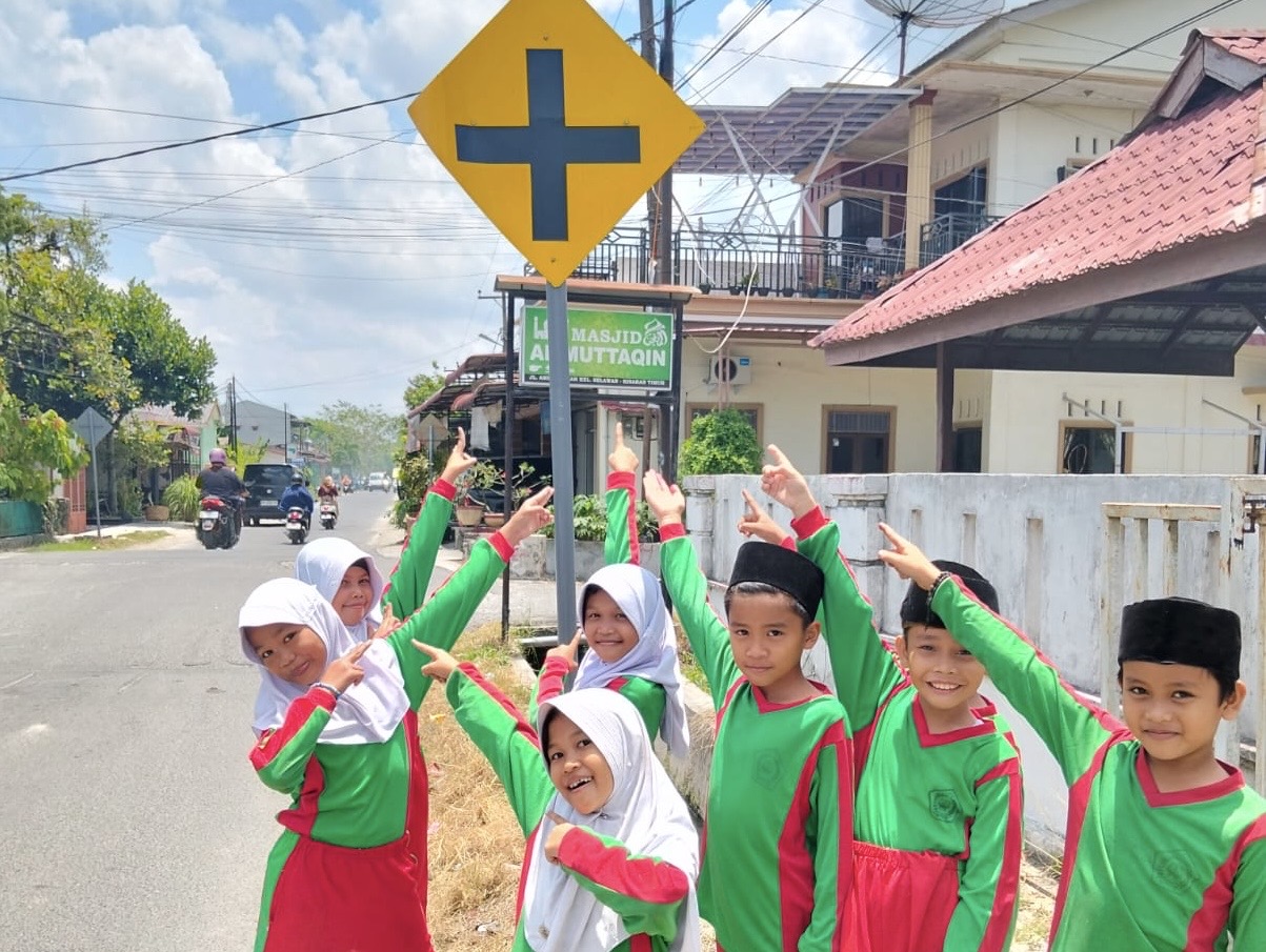 Kegiatan praktik ini juga dibuat menyerupai kondisi nyata di jalan raya. Siswa berperan sebagai pejalan kaki, pengendara, hingga petugas lalu lintas. Mereka tampak sangat bersemangat saat memeragakan cara menyeberang jalan yang benar, memahami lampu lalu lintas, serta mengenali rambu peringatan, larangan, dan petunjuk.